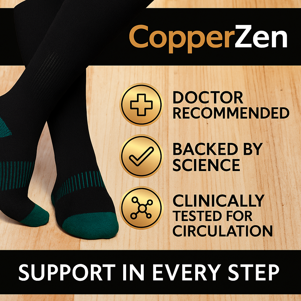 Experience all-day pain relief, improved circulation, and unmatched foot comfort with CopperZen Socks â infused with real copper ions and designed using advanced compression technology. These anti-odor, anti-fatigue socks help reduce swelling, fight bacteria, and boost recovery for tired legs. Whether you’re at work, traveling, or relaxing, CopperZen Socks deliver the support and wellness your feet deserve. Trusted by thousands for daily mobility support and foot care.!