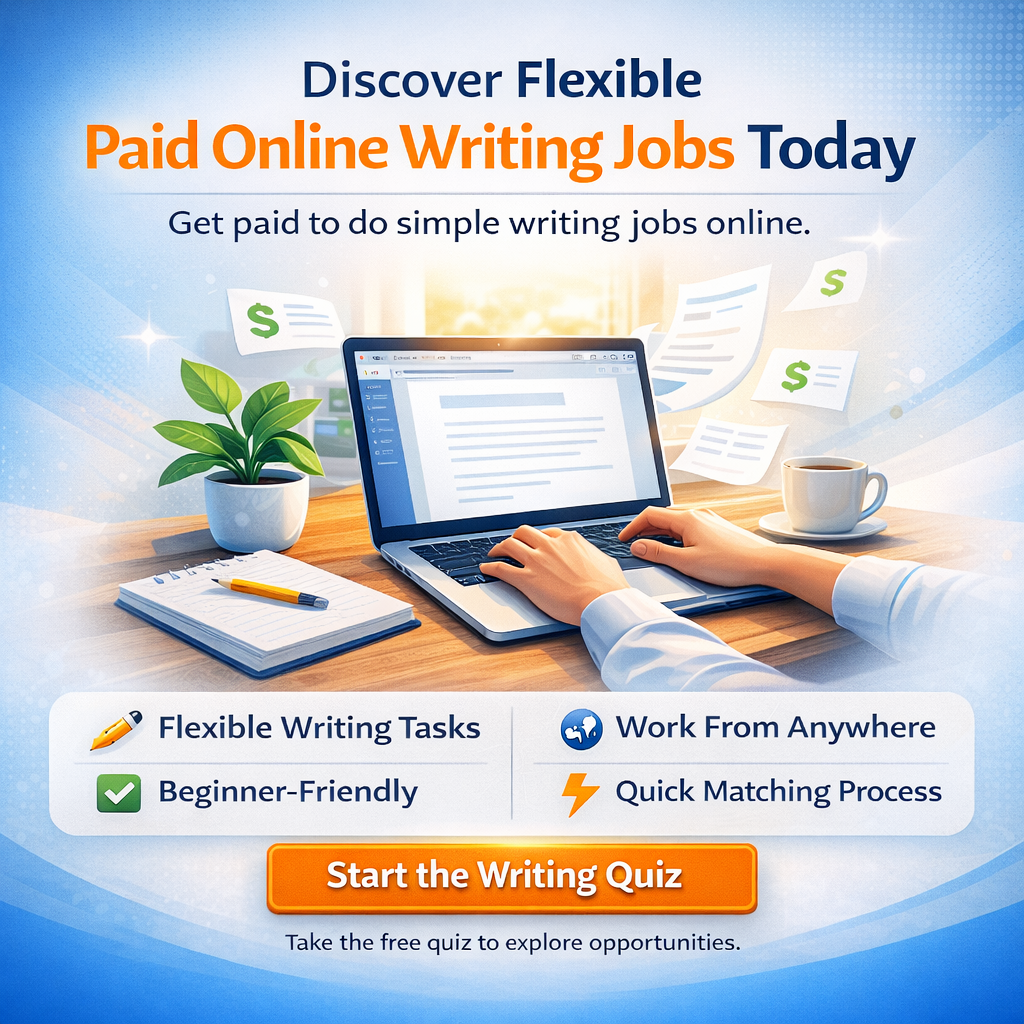 Paid online writing jobs connects writers with remote freelance writing tasks. Best for adults 18+, beginners & experienced writers seeking flexible income, training, and diverse writing gigs.
