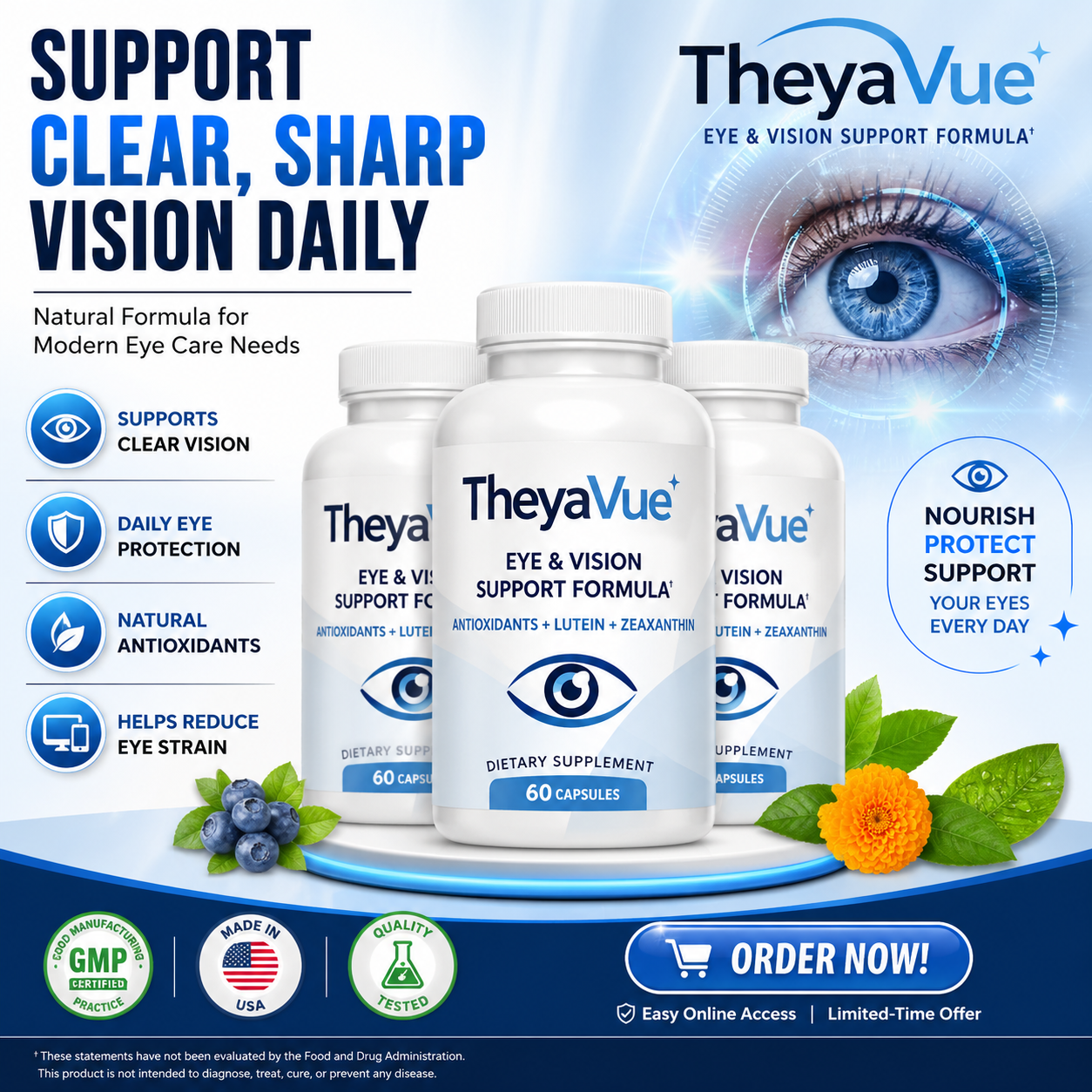 TheyaVue Eye Support+ is a vision formula designed for adults, especially 30+. It supports eye health and clarity. It may help reduce strain, while improving daily visual comfort.